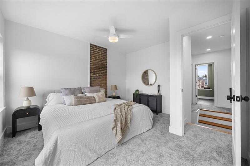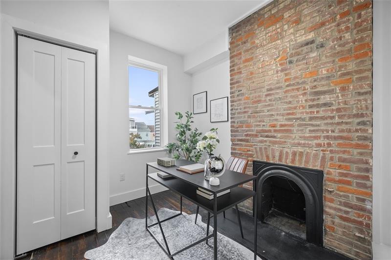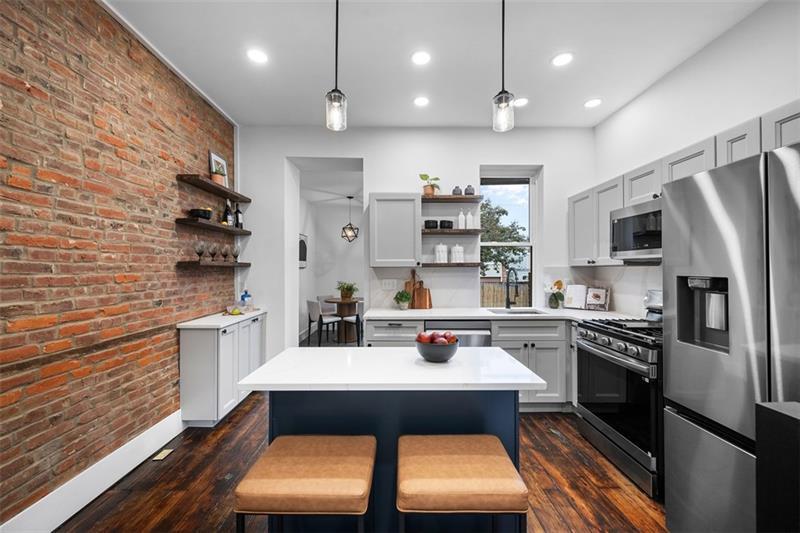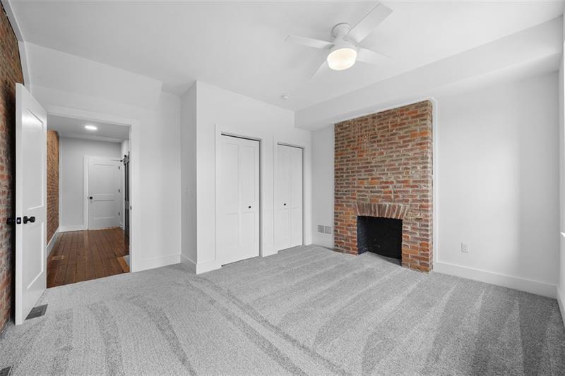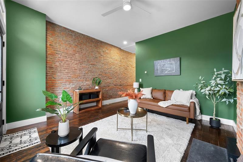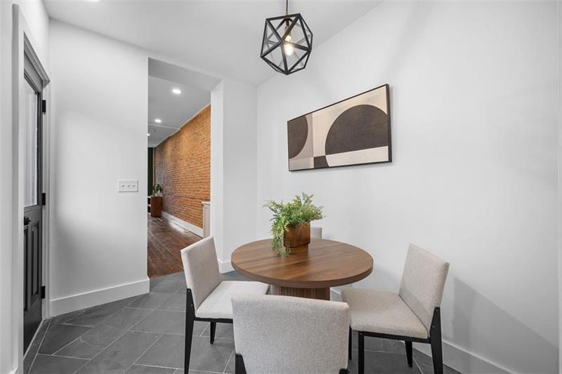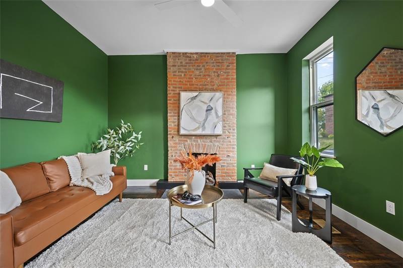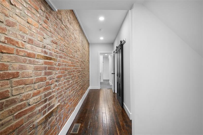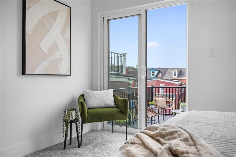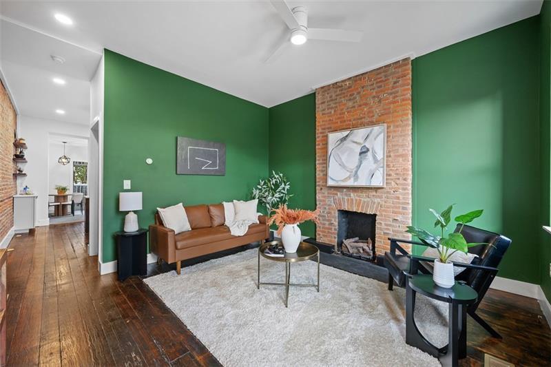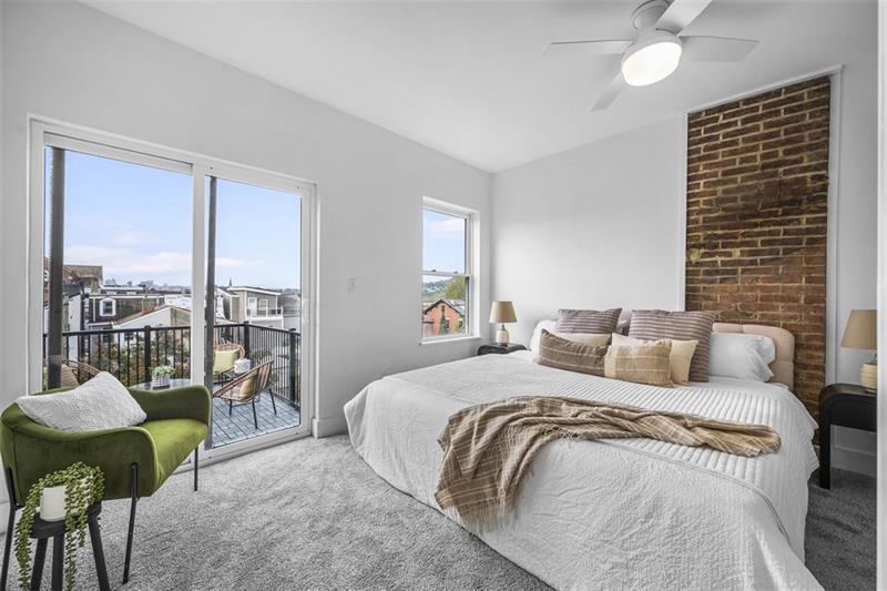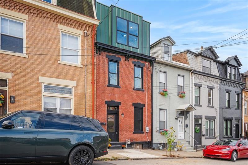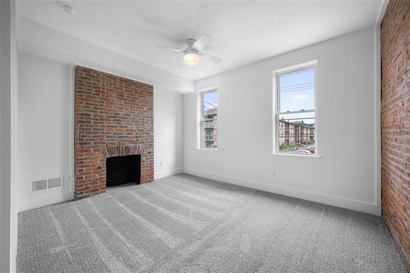 Stunning, newly renovated townhome in the heart of Lawrenceville! Step inside to the inviting living room featuring an exposed brick fireplace and accent wall that leads into the chef's kitchen with granite countertops, a large island, and stainless steel appliances. The dining room offers exterior access, perfect for entertaining, and a convenient powder room completes the main level. Upstairs, you'll find a spacious bedroom with a brick fireplace and double closets, a second bedroom that is SOUND PROOF behind a stylish barn door, and a beautifully updated full bathroom with a tiled shower and laundry area. The top floor features a private loft-style primary suite with balcony access and a luxurious upgraded bathroom. Enjoy relaxing on your balcony or in the courtyard below. One off-street parking space completes this exceptional home. Steps from away Leslie Park, Allegheny Cemetery and UPMC Children's Hospital! Don't miss this one!