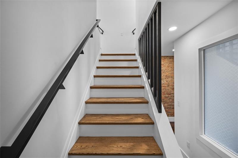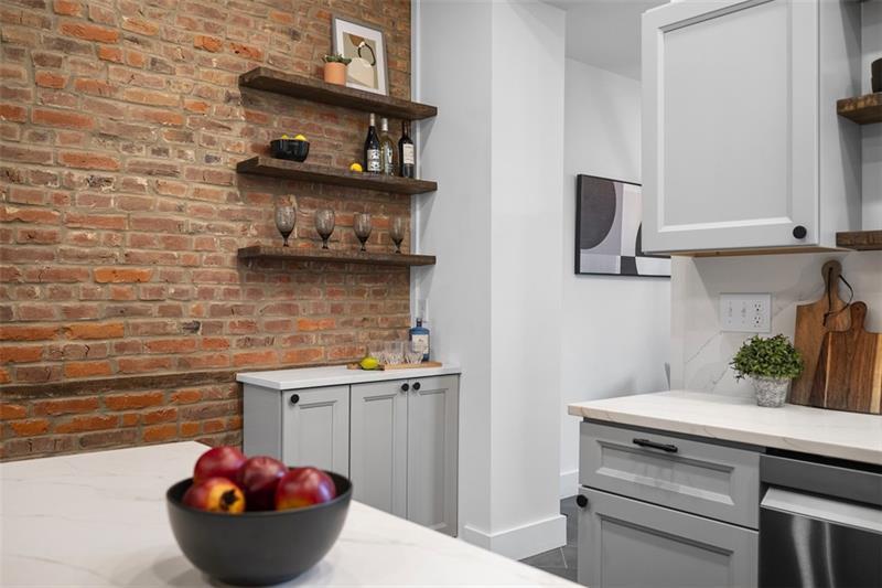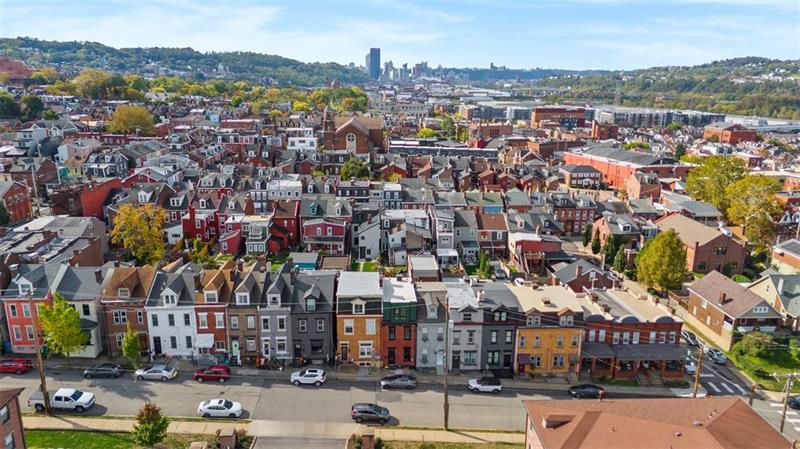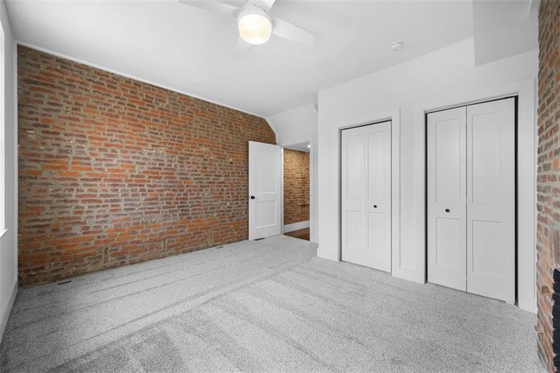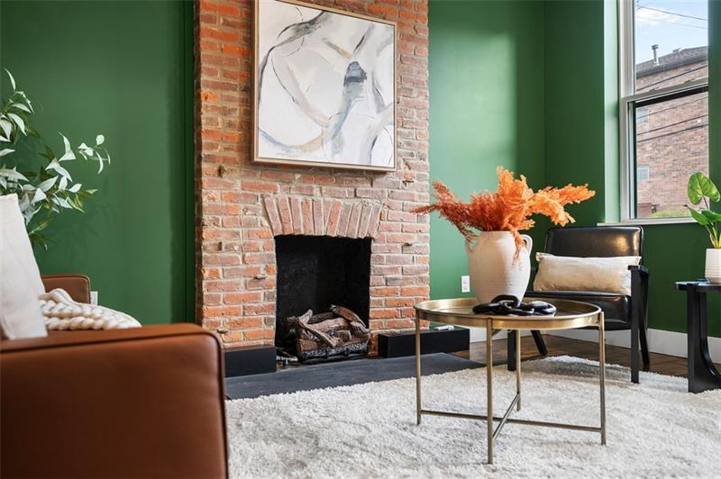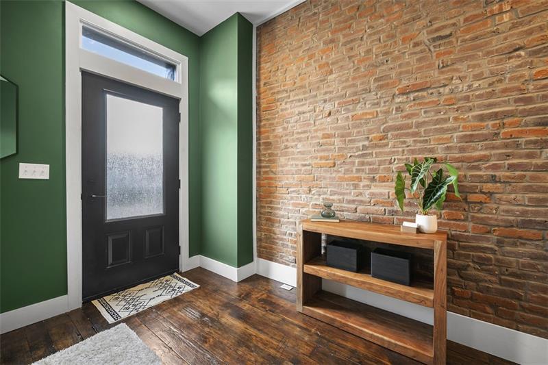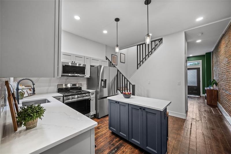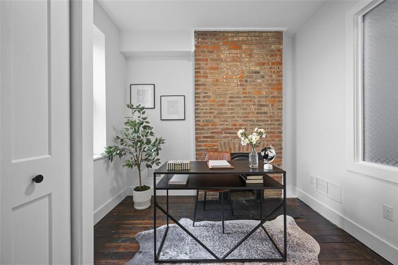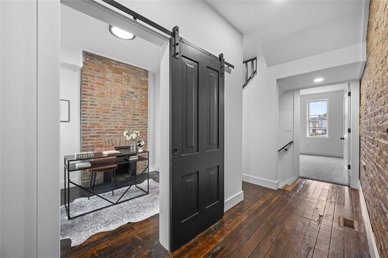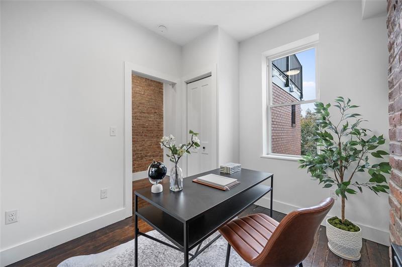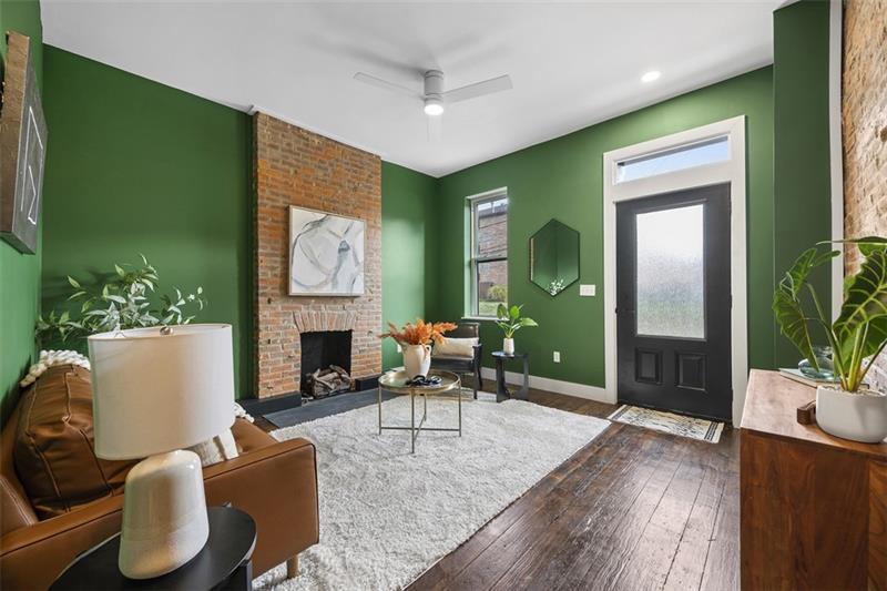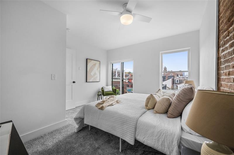 Stunning, newly renovated townhome in the heart of Lawrenceville! Step inside to the inviting living room featuring an exposed brick fireplace and accent wall that leads into the chef's kitchen with granite countertops, a large island, and stainless steel appliances. The dining room offers exterior access, perfect for entertaining, and a convenient powder room completes the main level. Upstairs, you'll find a spacious bedroom with a brick fireplace and double closets, a second bedroom that is SOUND PROOF behind a stylish barn door, and a beautifully updated full bathroom with a tiled shower and laundry area. The top floor features a private loft-style primary suite with balcony access and a luxurious upgraded bathroom. Enjoy relaxing on your balcony or in the courtyard below. One off-street parking space completes this exceptional home. Steps from away Leslie Park, Allegheny Cemetery and UPMC Children's Hospital! Don't miss this one!