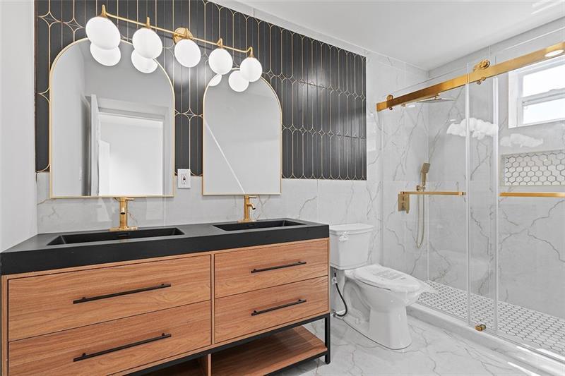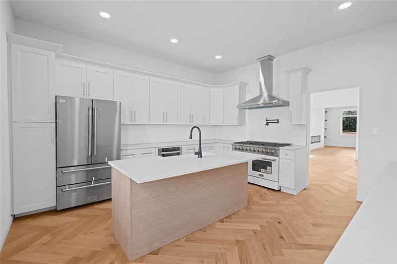 All New high end kitchen with island.New Bathrooms,new roof, new windows. New electric system, plumbing and 3 zone heating and cooling.New hot water tank, new flooring . Laundry room upstairs.