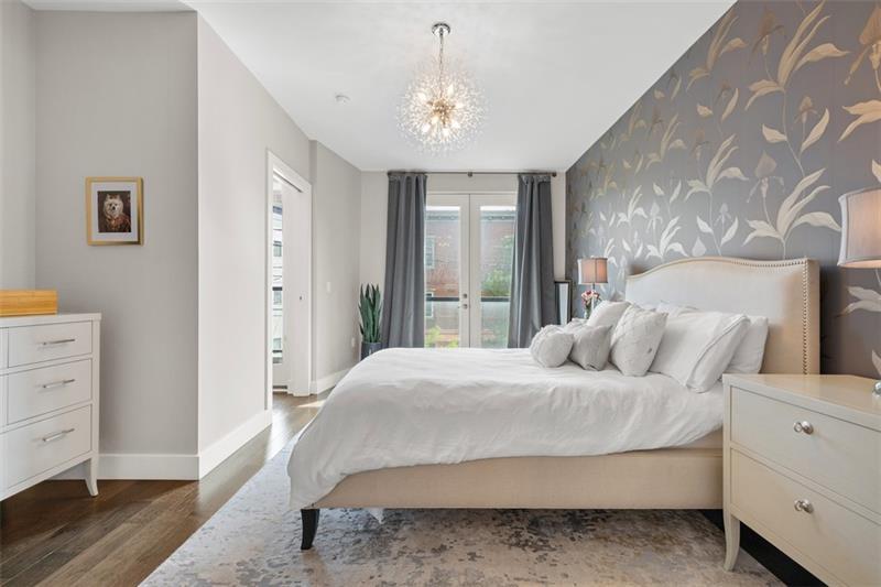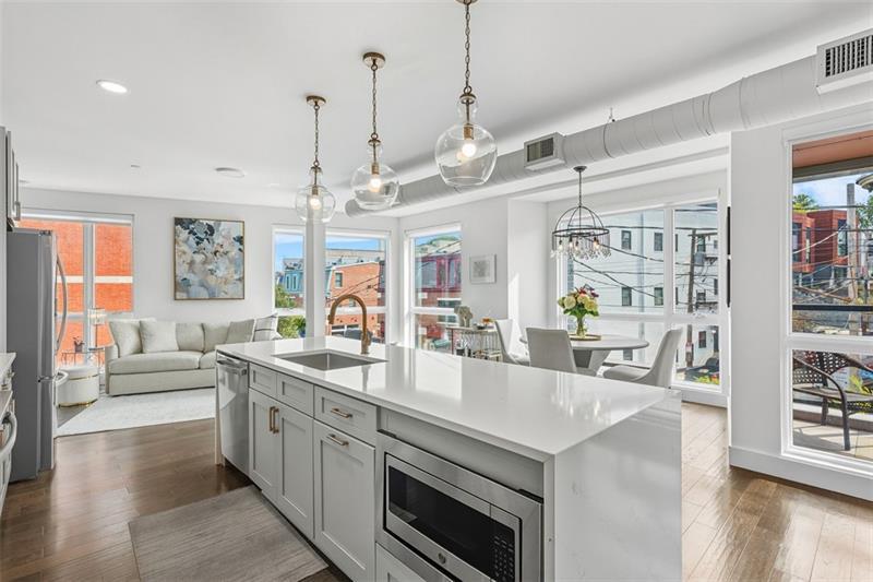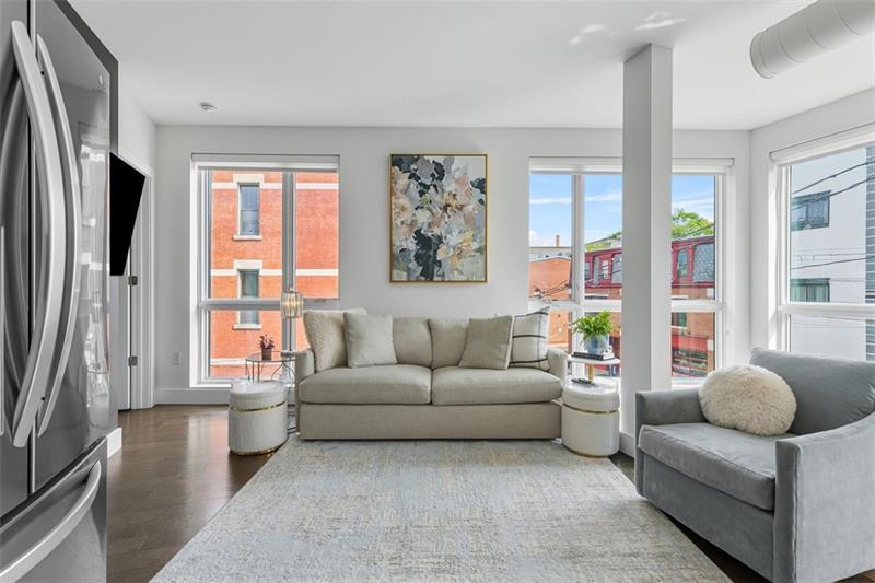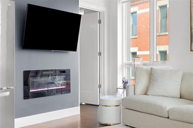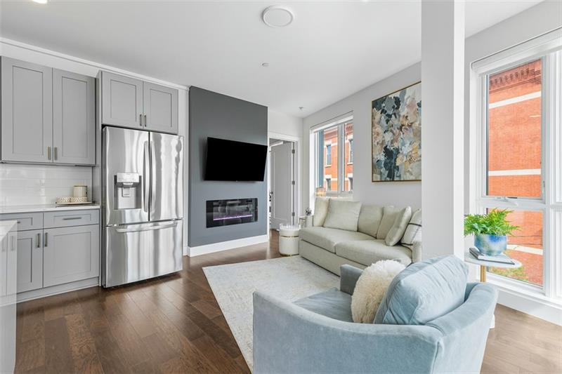 Introducing Unit #304 at Lawrenceville Lofts, a beautifully designed corner residence offering light-filled, modern living in the heart of it all. Soaring ceilings and dramatic floor-to-ceiling windows showcase sweeping views of Butler Street, while the open-concept layout creates an effortless flow throughout the main living space. The kitchen is both functional and striking, featuring an oversized waterfall island with seating, sleek finishes, and thoughtful upgrades. Designer lighting and custom, privacy window treatments carry throughout the home, adding a refined touch to each space. The spacious living area is anchored by a cozy fireplace, creating the perfect balance of style and comfort. The owner's suite offers a true retreat with a generously sized bedroom, a walk-in closet with custom shelving, and a spa-inspired en-suite complete with dual vanities. A versatile second bedroom, currently styled as a home office, also includes a walk-in closet and access to a full bath. Additional highlights include a deeded garage parking space and access to the building's rooftop amenities, including a dog park, fire pit, TV lounge, and entertaining areas. This pet-friendly building is ideally located just steps from Butler Street's vibrant mix of shops, restaurants, and cafés.