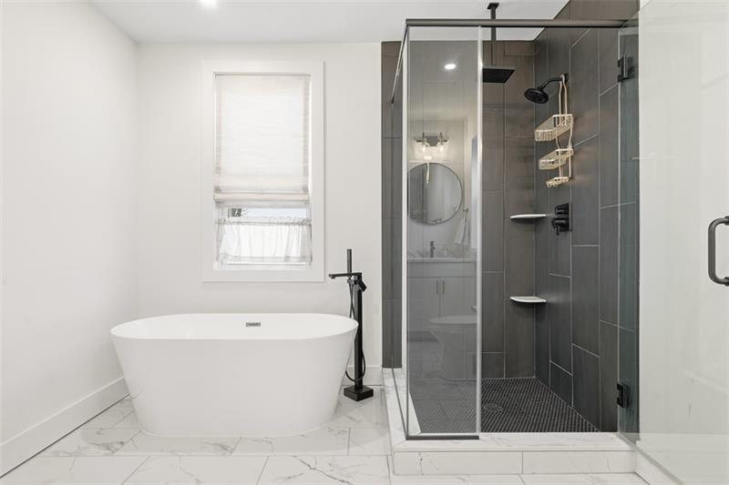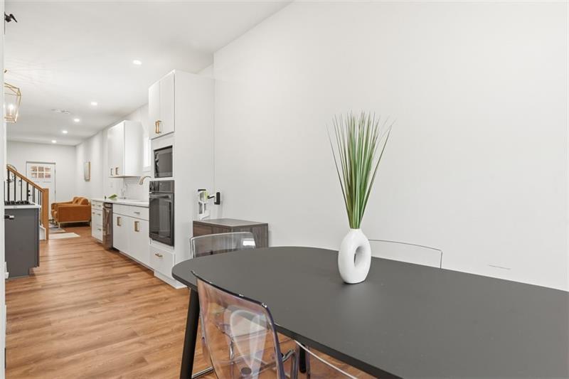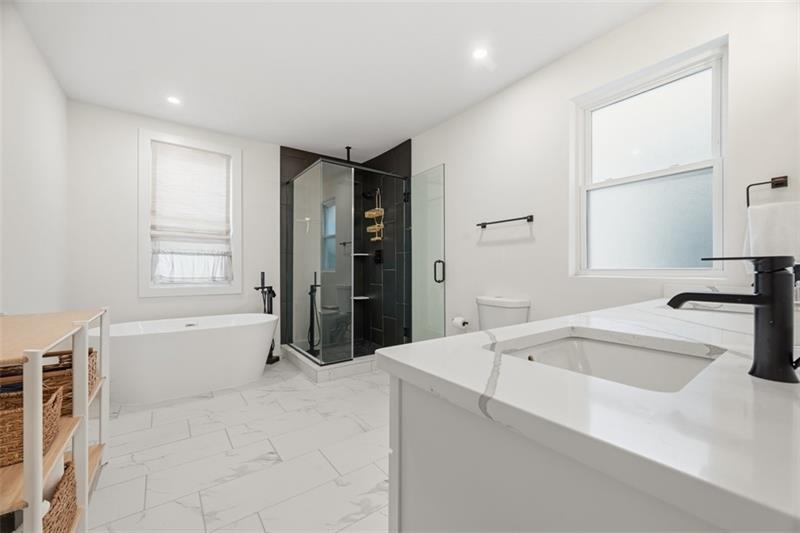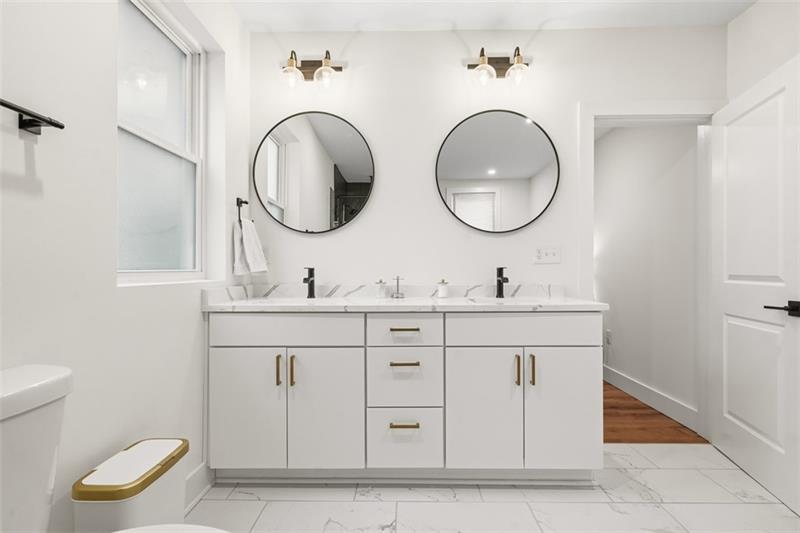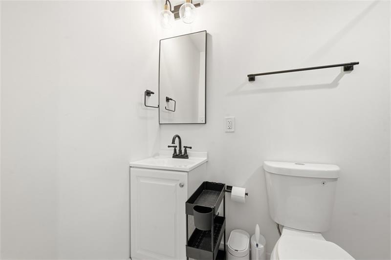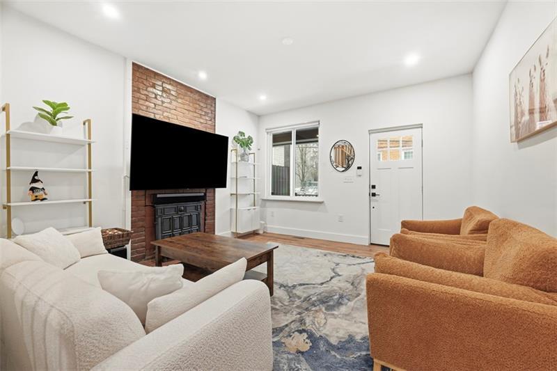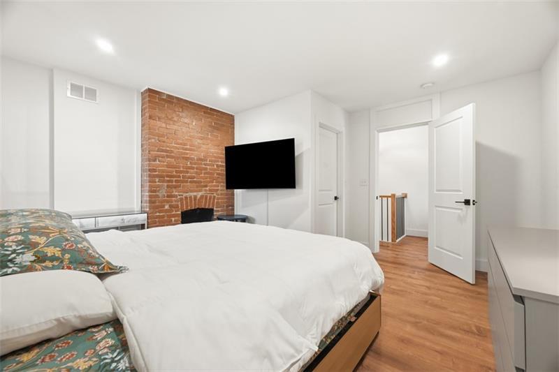Welcome to this stunning end-unit home in the perfect Lower Lawrenceville location with off-street parking and a fenced yard! Fully renovated in 2023-2024 with new roof, new exterior, new windows, new plumbing, new electrical, and a gorgeous new interior. The kitchen features beautiful quartz countertops, stainless steel appliances, beverage bar, ample cabinetry, and a nicely-sized island with seating. There is also a separate dining area that could double as a home office, along with a first-floor powder room. Upstairs you'll find the roomy primary suite with walk-in closet, soaking tub, tiled shower, and double vanity. The second bedroom also has an en-suite bath, making it perfect for guests. The finished lower level offers even more space for a gameroom, flex space, or home office, and includes another full bath as well!
